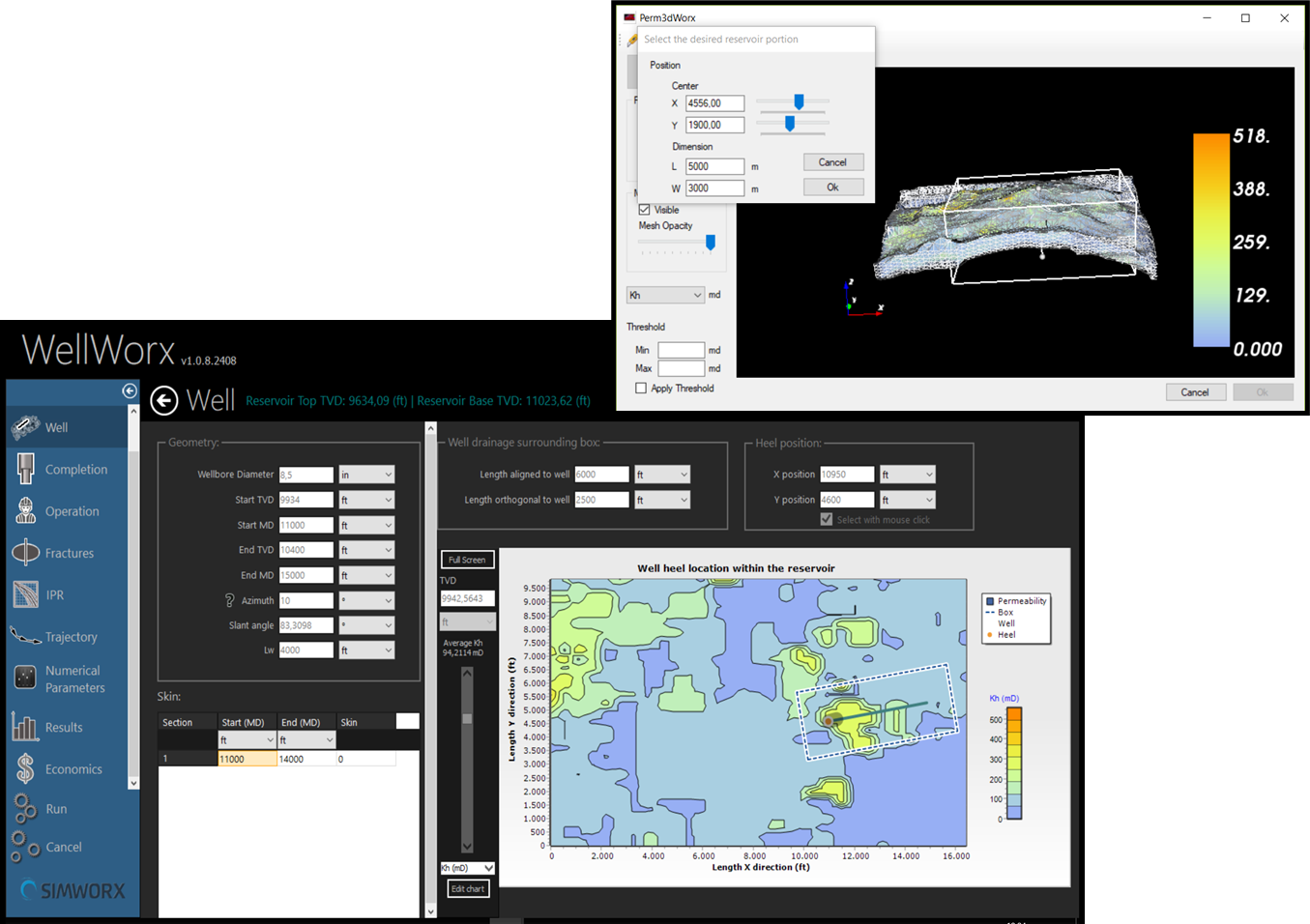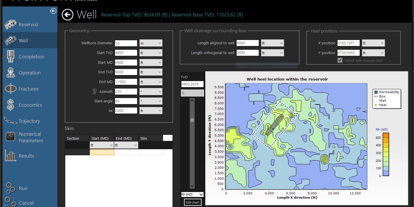WellWorx supports simulations of vertical, horizontal, and sloped wells with varying dimensions and azimuths, offering flexibility in well design for different reservoir conditions.