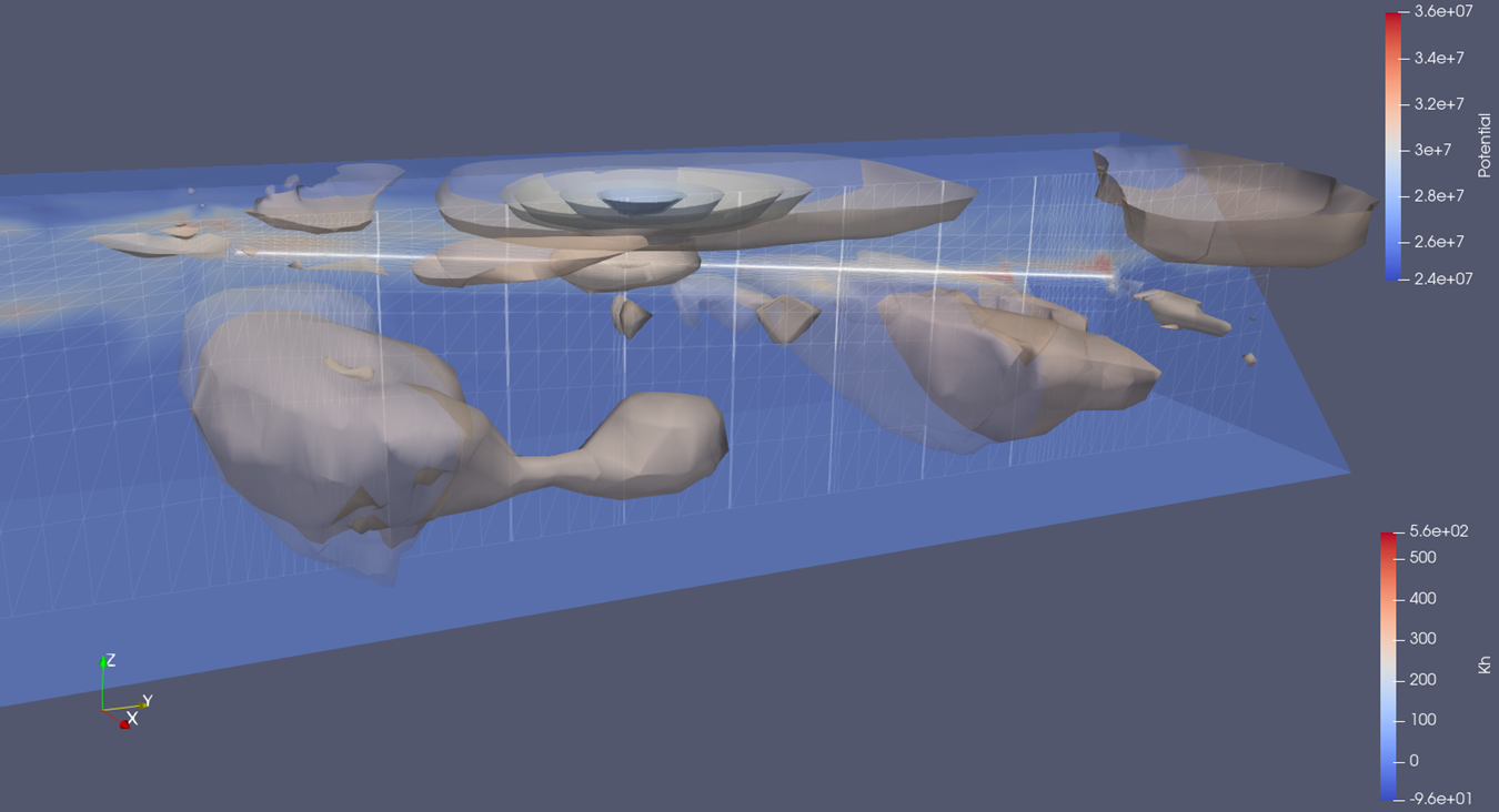 In this one, a horizontal multi-staged fracked well (3 and 2 fracs in each stage). Post processed using ParaView. Well put on production in a transient analysis.