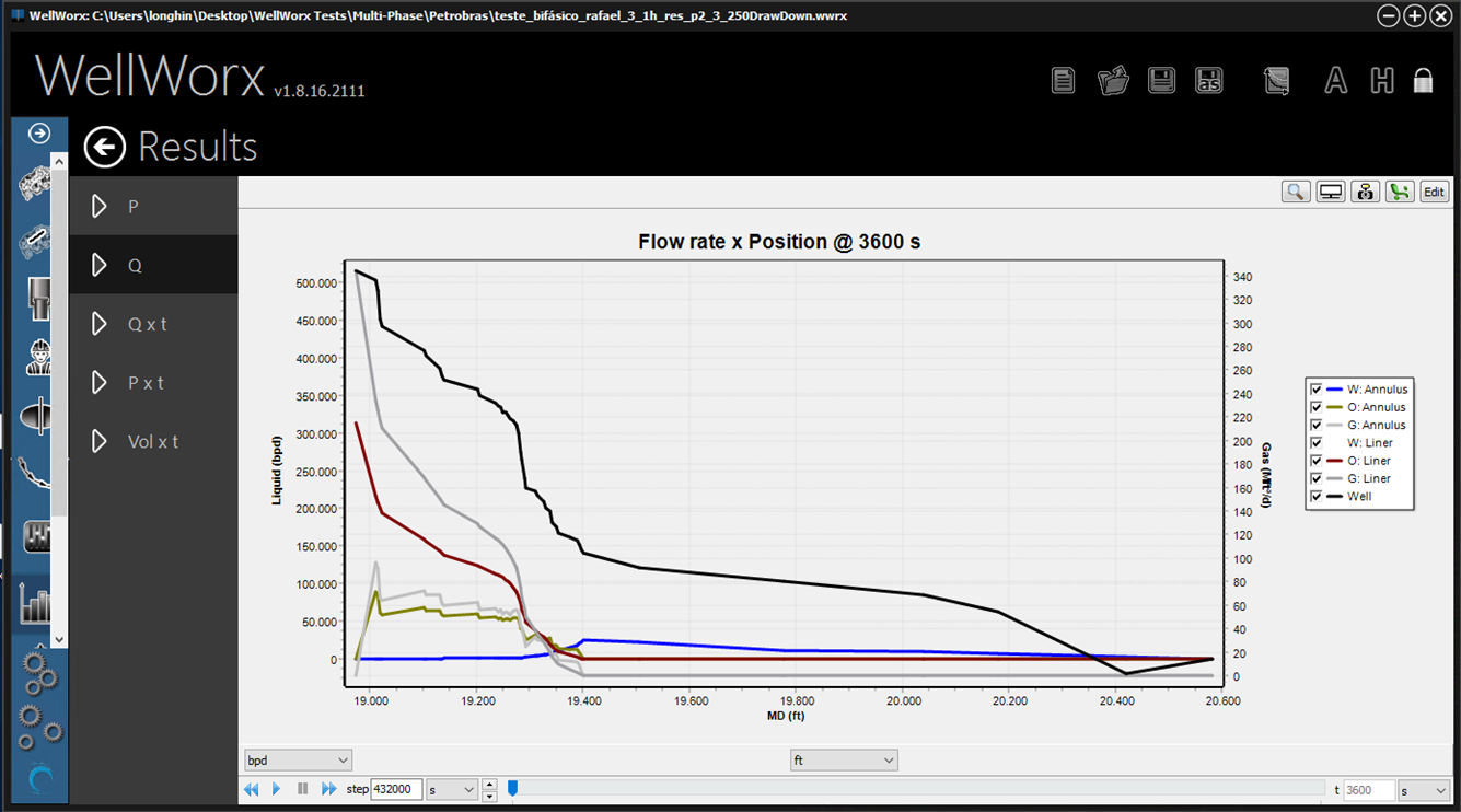 Simulation results are presented through charts where computed variables are plotted over time, such as production, accumulated volume, pressure mapping along the well, and flow rate distribution. Different designs can be compared to each other seamlessly with MatchWorx app.